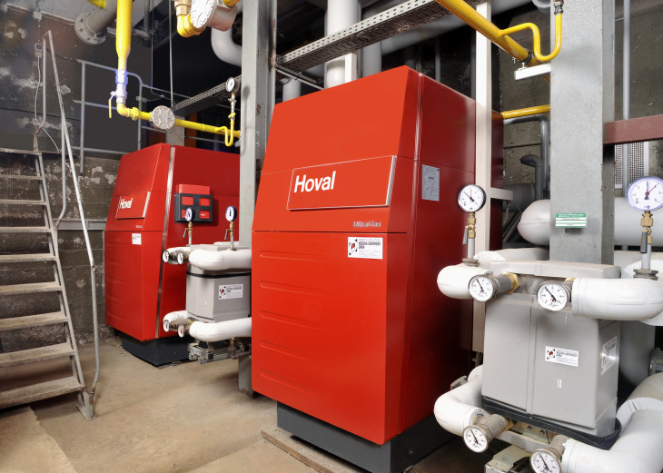 Ein weiteres Plus hat der Modul-plus im Kronebau ausgespielt: Er braucht nur wenig Aufstellfläche. Auch der Brennwert-Kessel UltraGas kommt mit wenig Platz aus. Was hingegen voll zur Geltung kommt, ist die Kaskaden-Lösung, welche die beiden Heizkessel bilden. Und für den Fall der Fälle ist das SMS-Modul installiert, das den Hoval-Kundendienst sofort informiert.