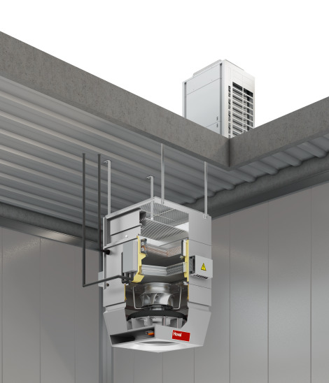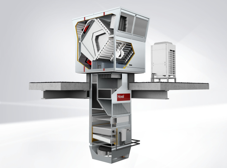Hoval räumt auf – buchstäblich: „Wenn wir von dezentralen Anlagen sprechen, denken wir jetzt nicht mehr allein an RoofVent- und TopVent- Geräte, sondern auch an dezentrale Wärmepumpen“ sagt Loris Basso, Produktmanager Hoval Hallenklima-Systeme. Eine platzsparende Gesamtlösung ist das Resultat.