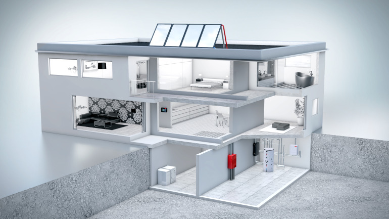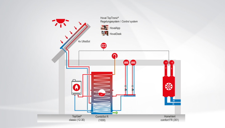 Eine Gesamtlösung, die verschiedene Energiequellen einbezieht, braucht nicht teuer zu sein. Aber sie erfordert das Know-how des Spezialisten, damit die einzelnen Komponenten perfekt zusammenspielen. Die Gesamtlösung für Ihr neues Einfamilienhaus oder für den Ersatz Ihrer bisherigen Heizung kann zum Beispiel aus thermischen Sonnenkollektoren UltraSol und aus einem wandhängenden Gas-Brennwertkessel TopGas classic bestehen. Eine Komfortlüftung HomeVent comfort FR komplettiert Ihr System. Vor allem wenn Ihr Neubau gut gedämmt ist, wird ein regelmäßiger Luftaustausch nötig.