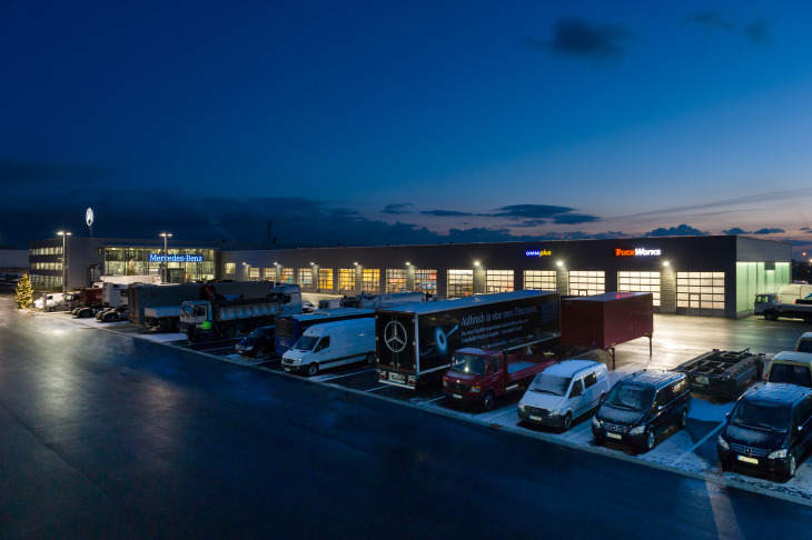 Im dreigeschossigen Hauptgebäude befindet sich, zusätzlich zu Verwaltung und Lager, ein Ausstellungsraum. Daran schließt sich einerseits die LKW-Werkstatt an mit Waschstraße samt Wasseraufbereitungsanlage, andererseits die Transporter-Werkstatt mit Serviceräumen.