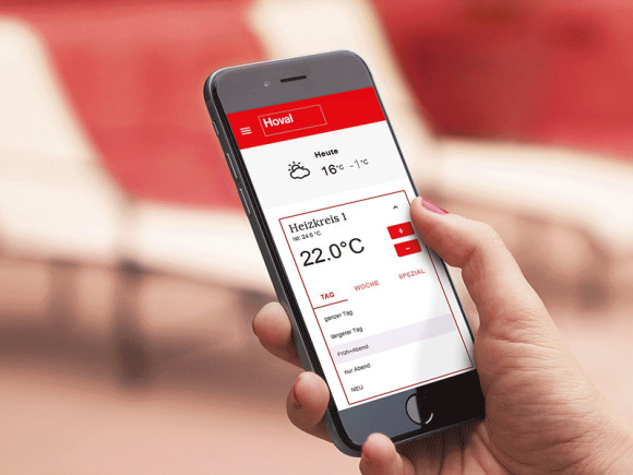 Durch das Zusatzpaket HovalConnect wird die Wärmepumpe mit dem Internet verbunden und kann via Smartphone oder PC bedient werden.