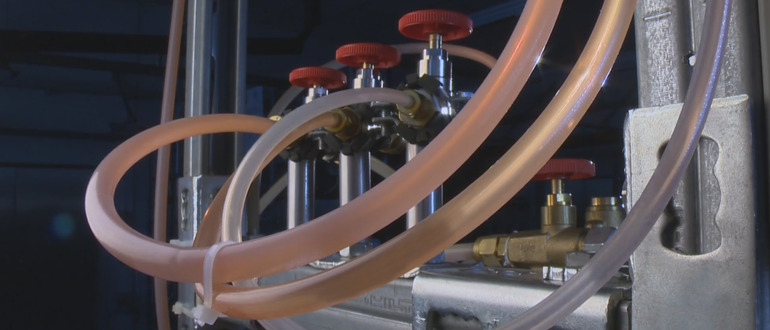 Hoval hat einen Prüfstand mit drei Ölleitungen ausgerüstet: mit einer im Durchmesser zu kleinen, einer zu großen und einer passend dimensionierten Leitung. In der zu kleinen Ölleitung wird das Öl nur mit Mühe angesaugt, es beginnt zu verdampfen, und es bilden sich schnell Gasblasen. Der Zerstäubungsdruck schwankt. Die Flammen des Brenners reißen ab, die Störung ist unvermeidbar.