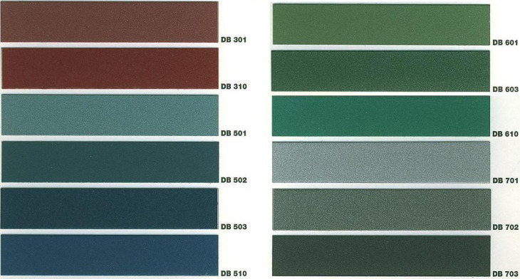 Grundsätzlich sind die DB-Farben an die RAL-Farbtöne angelehnt, jedoch weichen sie durch den hohen Anteil an Eisenglimmer von den RAL-Varianten deutlich ab. Es entsteht ein vergraut glitzerndes Erscheinungsbild.