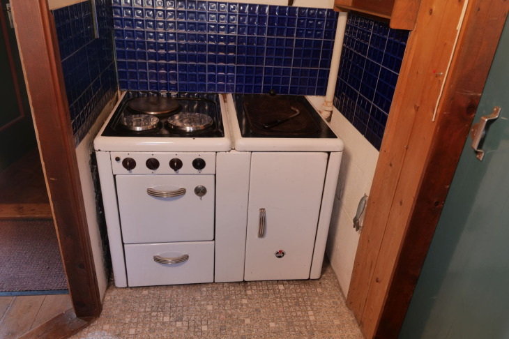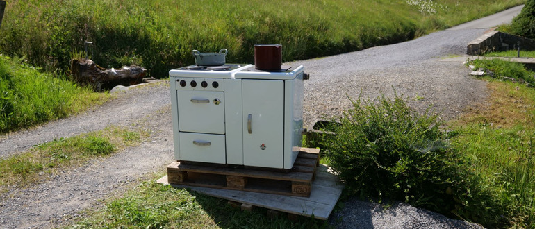 Mit viel Mühe wurde der schwere Ofen 1968 bergauf transportiert und in eine ca. 5m² große Küche eingebaut, wo er über 50 Jahre bis Frühjahr 2020 seine Dienste tat. Mit diesem Ofen wurde viel gekocht, gebraten und vor allen Dingen auch gut eingeheizt.
