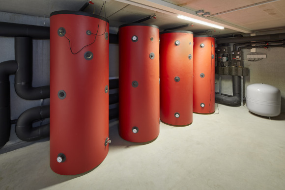 Eine wichtige Ergänzung für einen ressourcenschonenden Betrieb der Heizanlage sind die EnerVal Warmwasserspeicher. „Die vier Schichtenspeicher aus Stahl wirken wie ,Batterien‘ zum Speichern von Heizenergie. Erzeugung und Verbrauch von Heizenergie lassen sich damit entkoppeln“, erklärt Hoval Gebietsleiter Oliver Scisly die Besonderheiten des Systems.