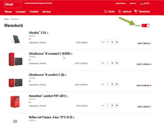 Sie legen ihre Hoval Produkte wie gewohnt in den Warenkorb. Sind alle gewünschten Produkte im Einkaufswagen scrollen Sie im Warenkorb ganz nach unten.