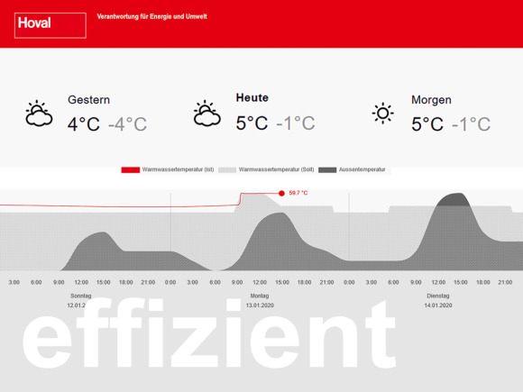 Als einzige Heizung am Markt nutzt Hoval die standortbezogenen Wetterdaten für mehr Energieeffizienz. Ist etwa Sonnenschein angekündigt, überlässt das System die Warmwasserbereitung der Solaranlage, vermeidet eine Überhitzung der Räume und spart damit Heizkosten.