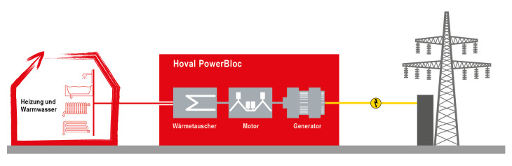 Hoval bietet standardisierte Gesamtlösungen, die praktisch jedes Bedürfnis und jede mögliche Anwendung abdecken. Die Leistungspalette reicht dabei von 12-520 kW. Das kompakte Erdgas-BHKW PowerBloc EG (20) als kleinstes Standardmodell erbringt eine elektrische Leistung von bis zu 12 kW und eine thermische Leistung von bis zu 43 kW. Sein Gesamtwirkungsgrad beträgt 103,2%. Mittelgroße Gebäude wie Hotels und Schulen, aber auch Mehrfamilienhäuser sowie Gewerbe- und Industriebauten sind mit dem PowerBloc EG (20) bestens bedient. Die Leistungspalette von Hoval reicht bis 530 kW: Das BHKW PowerBloc (520) zum Beispiel bringt es auf maximal 520 kW elektrische Leistung und auf maximal 687 KW thermische Leistung. Er kann mit Erdgas oder Biogas betrieben werden und ist vor allem für große Objekte konzipiert.